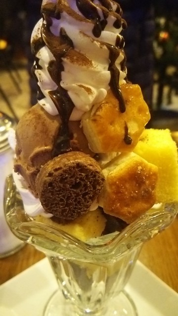こちらは「ティラミスパフェ」。ブラウニー、スポンジケーキ、生クリーム、アイス、パイの実、クッキーなど、具が沢山入っているとのこと。