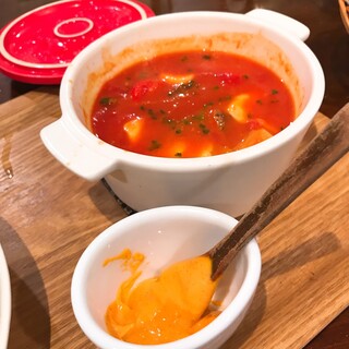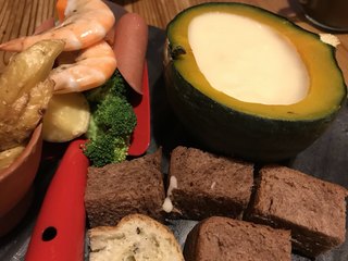 まもなく「チーズフォンデュ」到着〜〜。わぁ〜!映えるね〜〜♬盛り付けも凝ってますョ!スコップの上には、ブロッコリー、人参、ウインナーなど。チーズを付けて早速いただきます!最後まで美味しくいただき、最後はかぼちゃをほじくって食べました( ^ω^ )