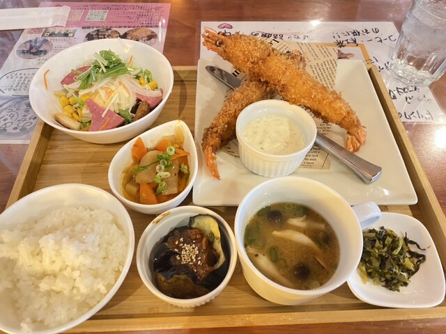 特大海老2尾、コロッケ、味噌汁、サラダ、高菜、茄子の肉みそ炒め、ご飯