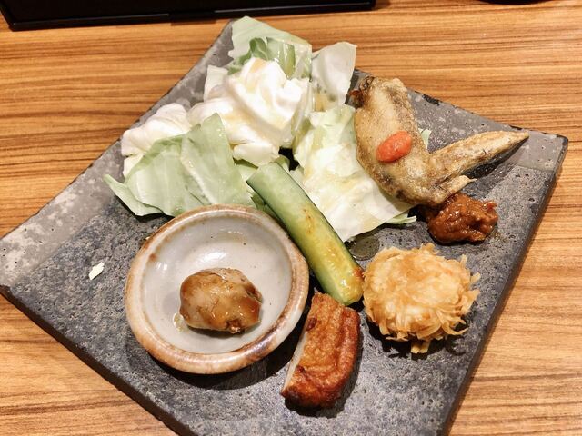 もつ鍋、枝豆、謎のウズラ卵、ポテト、えびせん揚げ、カツオタタキ、謎の鶏の炭火焼、とり南蛮、締めの鍋に...