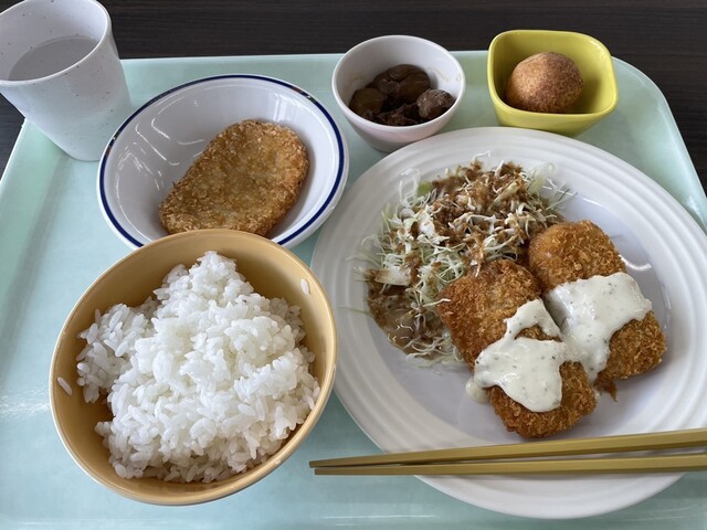 エビタルタル、白ご飯、鶏のレバー煮込み、ハッシュドポテトなどをいただきましたが、どのメニューも安定して美味しく、学食とは思えない満足感がありました。特にエビタルタルは食べ応えがあり、レバー煮込みもクセが少なく食べやすかったです。