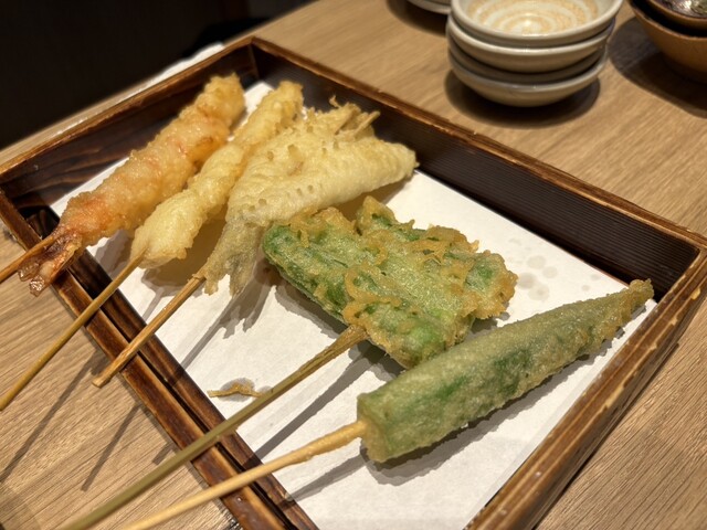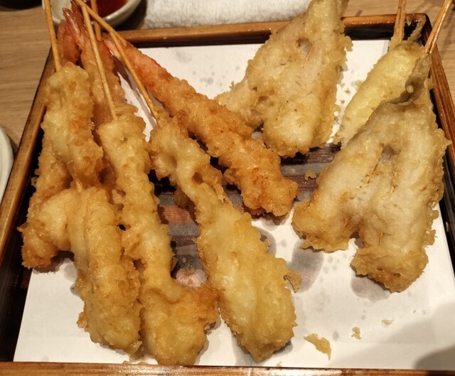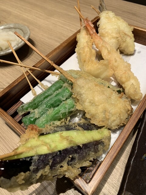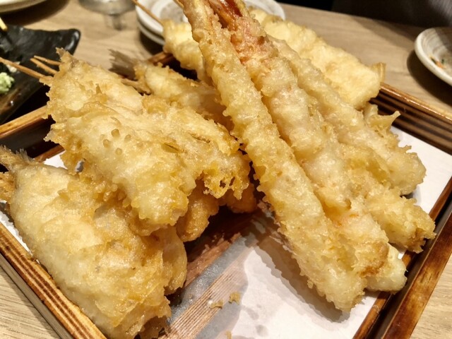 海鮮クリーミーサラダ、野菜天ぷら 二種、海鮮天ぷら 三種