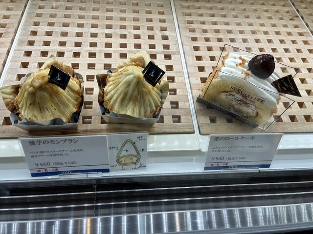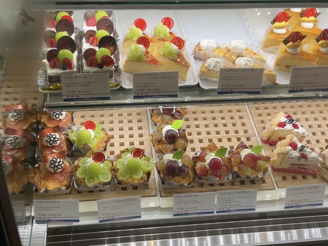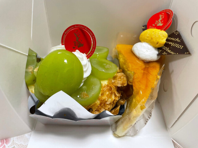 色々あって悩みますが、シャインマスカットのタルト(税込810円)とかぼちゃのスフレチーズケーキ(税込486円)をお願いします。私はシャインマ...