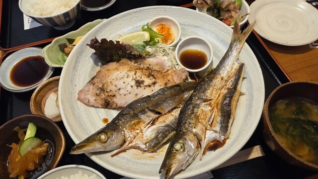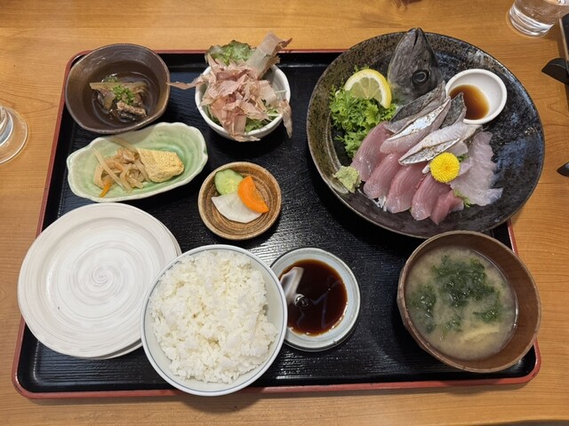 黒ムツと甲烏賊のお刺身3種盛り、おすすめ(おまかせ)焼き魚(本日は大きな鰆でした)、定食セット(ご飯とお味噌汁)あおさのおにぎり、烏賊としめじのバター炒め、おうどん、ドリンクを注文。お刺身(少し炙った...