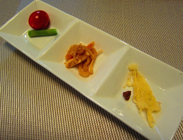 左からトマトとアスパラの塩麹漬け、醤油だけで味付けした切り干し大根、葱の根っこを揚げたものと蕗味噌