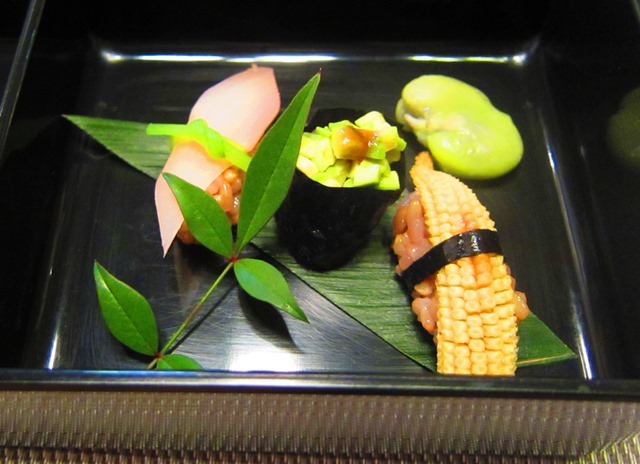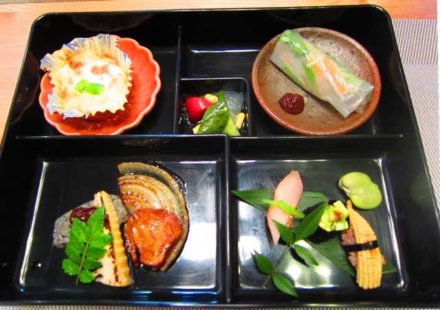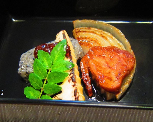 ・左下は胡麻ふとタケノコの焼物、淡路島産玉ねぎの焼物の上に小麦グルテンの焼豚風