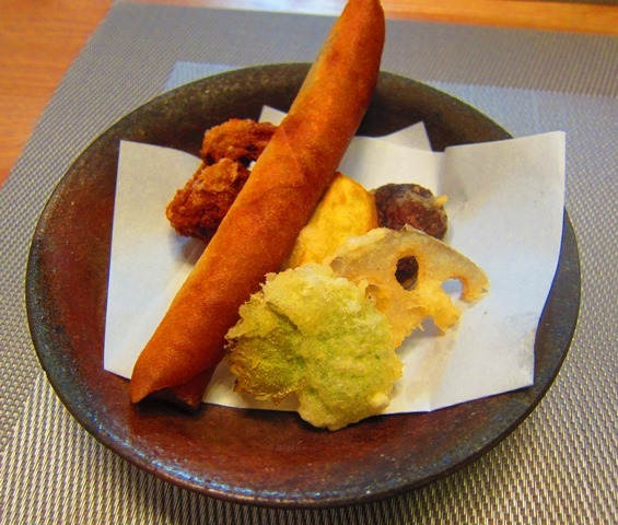 唐揚げ風の大豆でできたタプロ、椎茸、鳴門金時、キノコと牛蒡の重ね煮、蓮根とユキノシタです。