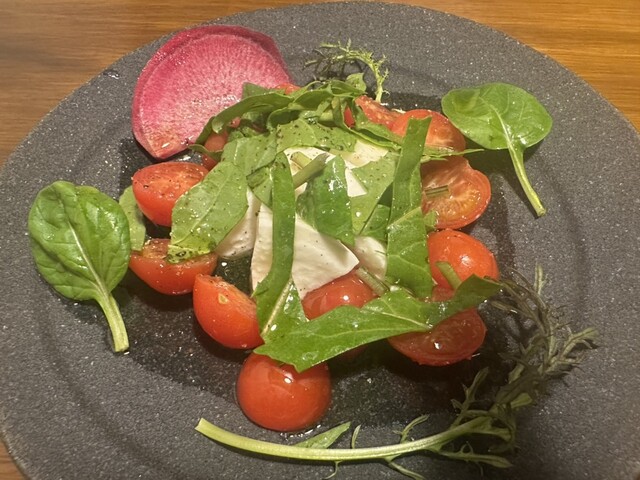 前菜5種、コースから、パスタは、少し太め?のパスタで、サーモンのクリームパスタ、辛くないアマトリチャーナ、別で、生ハムサラダ、カプレーゼ、ピッツァは...