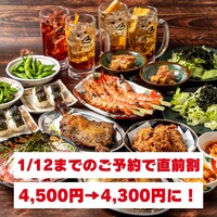 1月12日までにご予約いただいた方限定!クーポン利用で4,500円→4,300円に!必ずクーポンをご選択ください!がブリチキン。の名物を堪能できる!海鮮もおつまみも充実した贅沢なコースです!生ビール込みの120分飲み放題付き!(90分ラストオーダー)※1月末までのご予約が対象となります。2月以降のご予約はお問い合わせください。※クーポンの選択が無い場合は通常価格となります。