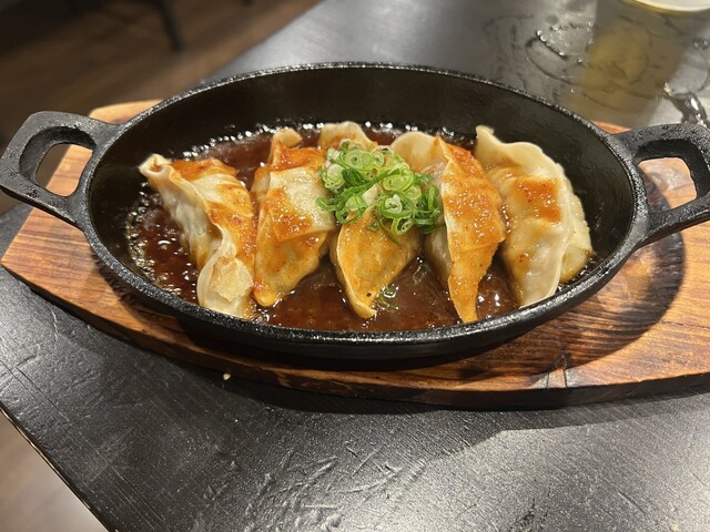 追加で鉄板焼き餃子をいただいてみましたけど、鉄板に乗せられ提供されますのでとても熱々。