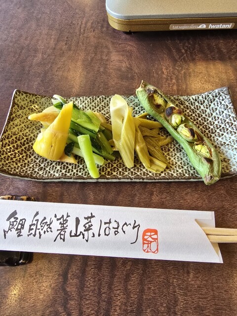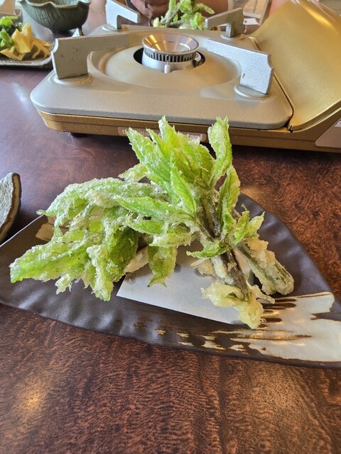 天ぷらはコシアブラと原木椎茸。どちらも香りがよく、揚げたてで美味。