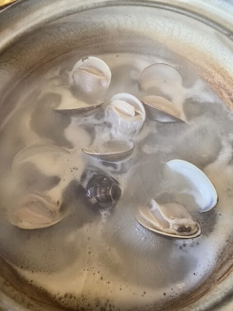 土鍋でじっくり火を通し、貝が開くのを待つ時間も楽しい演出。