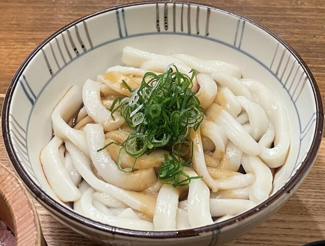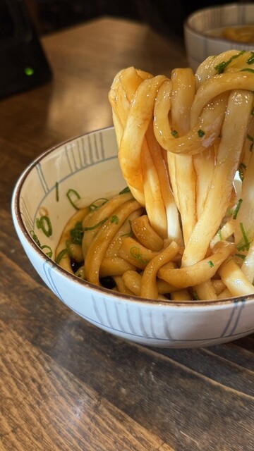 一般的なうどんのようにツユに浸ったものではなく、たまり醤油に鰹節、昆布等の出汁を加えた黒く濃厚なタレを、太い緬に絡め...