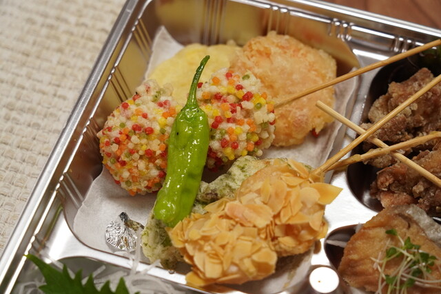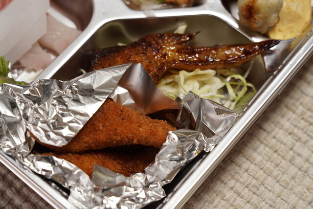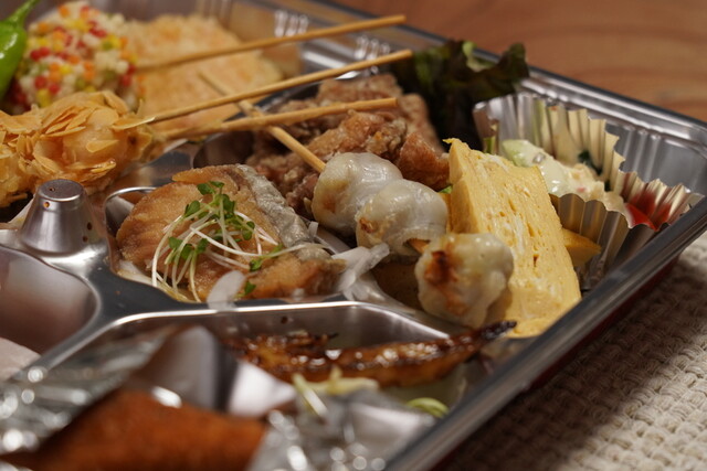 中身は刺身、天ぷら、魚フライ、鶏のから揚げ、手羽先、鶏軟骨、だし巻き卵、南蛮漬け、ポテトサラダ等。