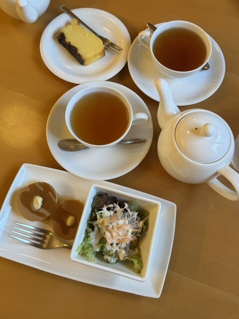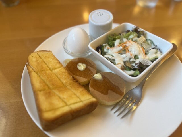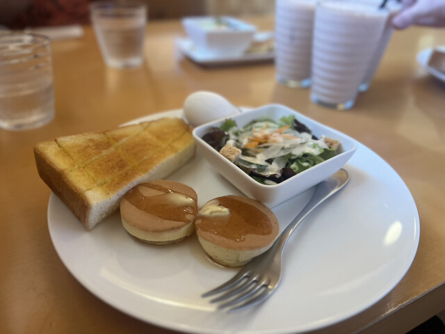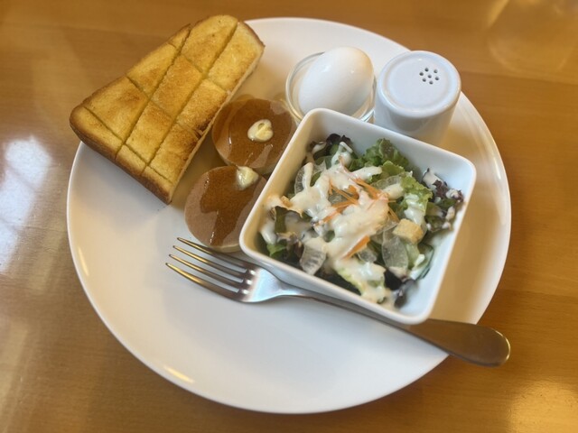 ドリンクはそれで。追加料金なしのサービスモーニングのミニホットケーキとサラダにしました。