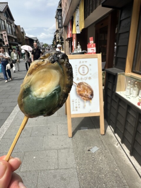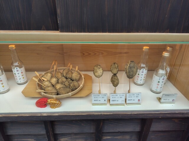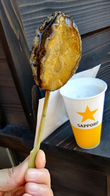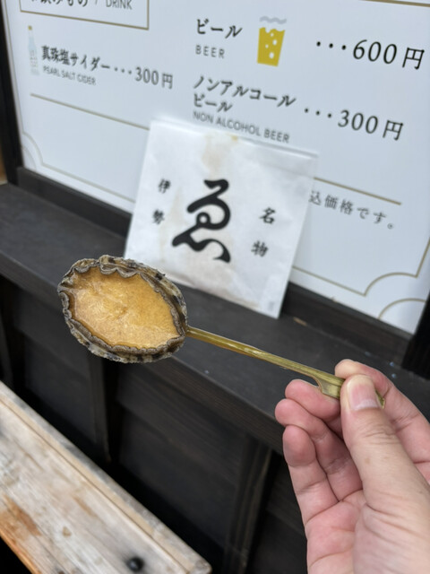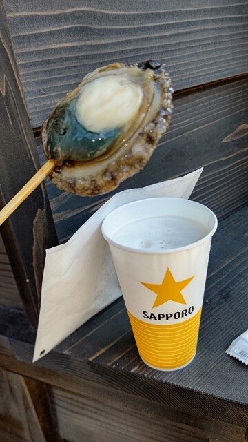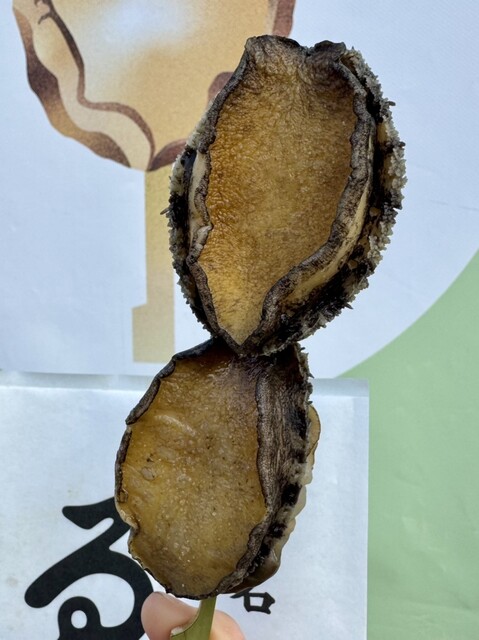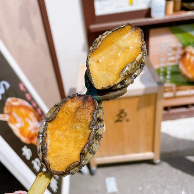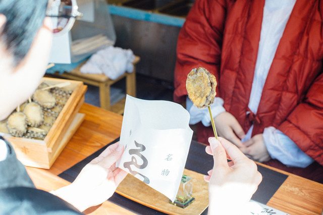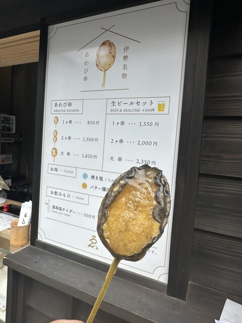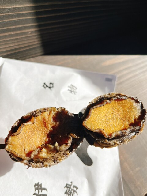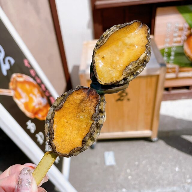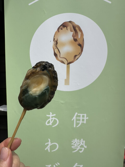 屋台では、活きあわびをボイルし、串に刺したあわび串をご提供。やわらかい肉厚のあわびを天然の焼き塩、風味豊かな自家製バター醤油で召し上がりください。