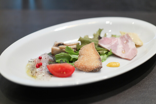 アミューズと前菜3種盛合せが付いた内容。 その後のお料理は当日アラカルトのメニューからお選びいただきます。