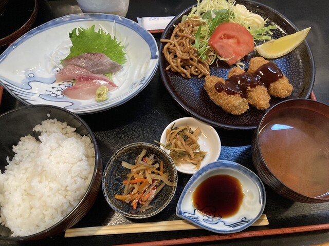 小上がりとカウンターのこじんまりした静かな店。 「丼もの」880円(税込)〜、魚フライはじめ各種「定食」990円〜。 刺身は地魚中心、「海老柳川」はいわゆる「天とじ」。 ... 詳細を見る