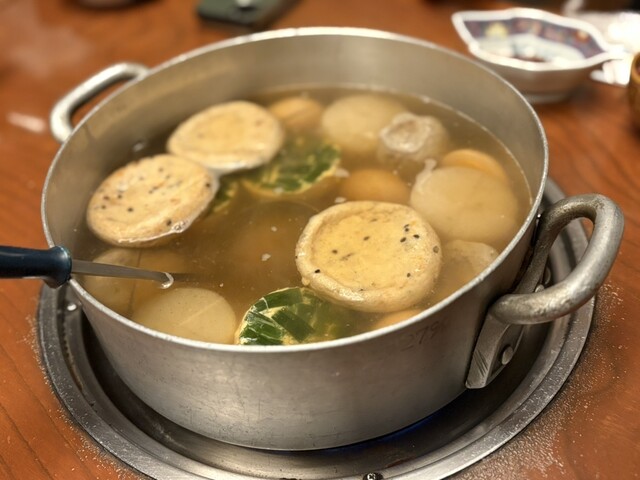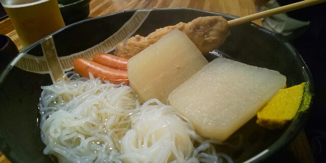 昭和24年先代が始めた屋台から三代にわたり引き継がれているおでん処。青森の陸奥湾で獲れるイワシの焼き干しと昆布からつくるおでんの出汁は「にごらず」「さっぱり」とした味わいで素材本来の味を邪魔せず、引き立てる。約25種類ほどのおでん以外のメニューも豊富なので一年中気軽に立ち寄れるお店。気さくな店員が醸し出す家庭的な雰囲気のお店は、女性一人からファミリー、サラリーマンなど幅広い層に利用されている。
