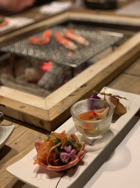 備長炭を使用した囲炉裏のような焼き台で、自分のペースで焼きながら食べれます。