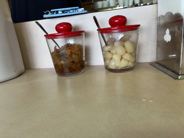 店内は厨房に面したカウンター席と厨房に背を向けた窓側のカウンター席の構成で、壁中に手作りメニューの写真が貼られており、賑やかな雰囲気です。