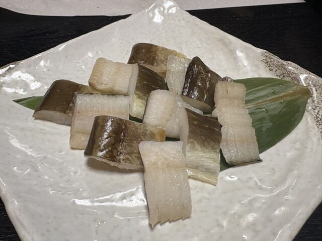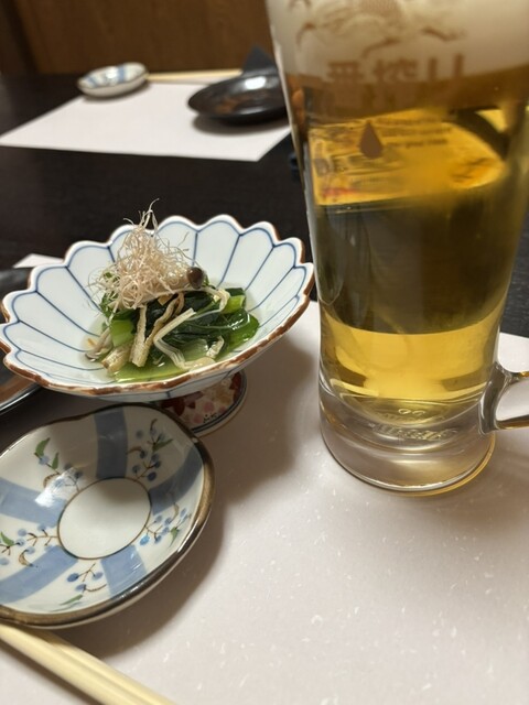 お通しの小松菜ときのこのおひたしがきちんとお出汁が感じられてかつ上品。もう、おいしいお店なんだなとわかります。