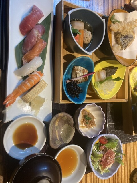 お祝いランチで波奈さんへ... 特別なお祝いということで奮発ランチ!寿司に天ぷら、刺身、焼魚、煮物、豆腐、サラダとプレート乗り切らないほど満載!早速、ベジファーストにて生ハムサラダを食し、豆腐や刺身に...