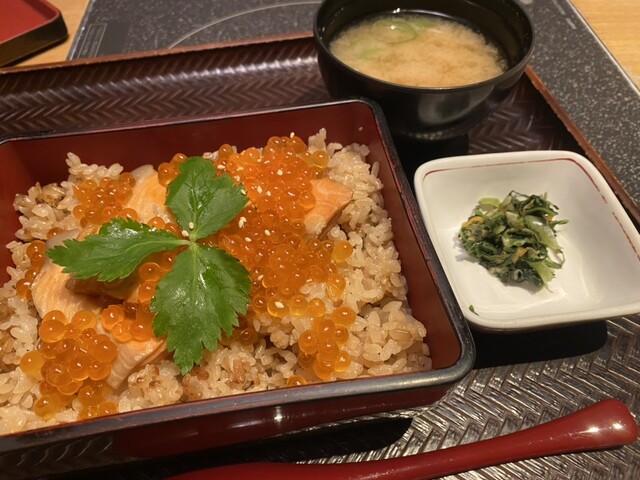 【はらこ飯】醤油で炊かれたご飯の上に、鮭の切り身といくらが贅沢に盛られた宮城の味覚。濃厚な鮭といくらの塩気が調和し、旅情を誘う一膳。
