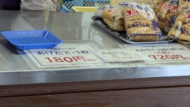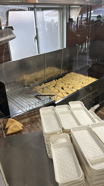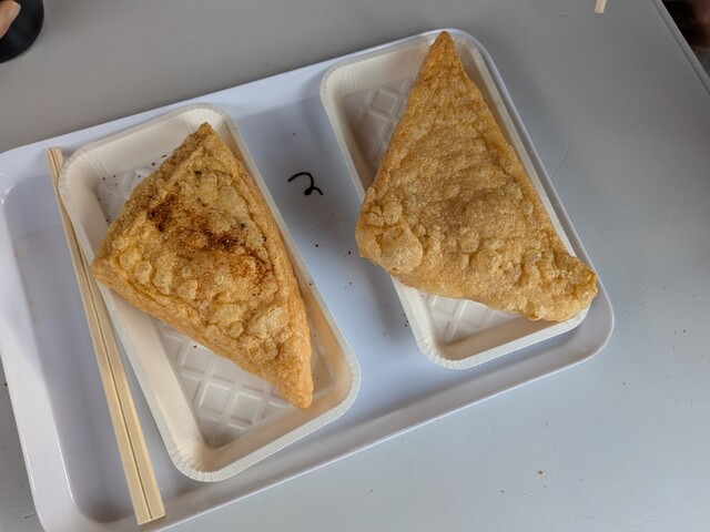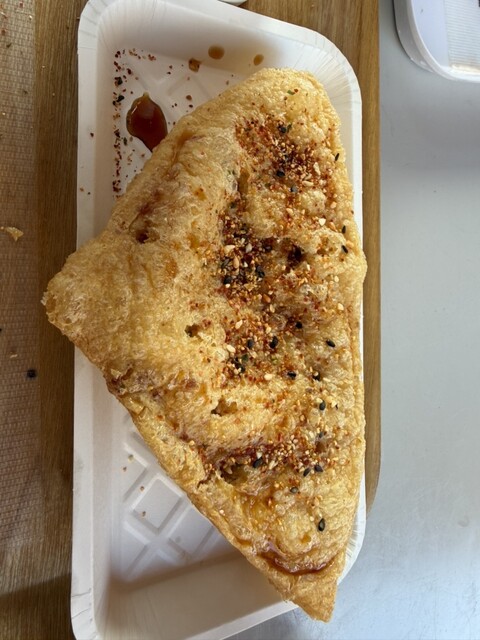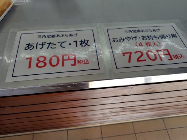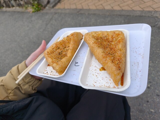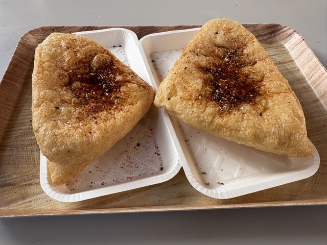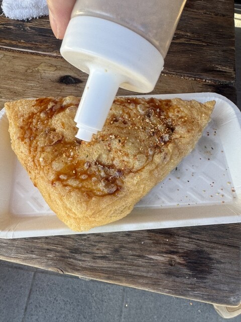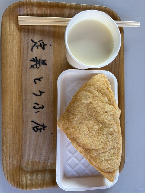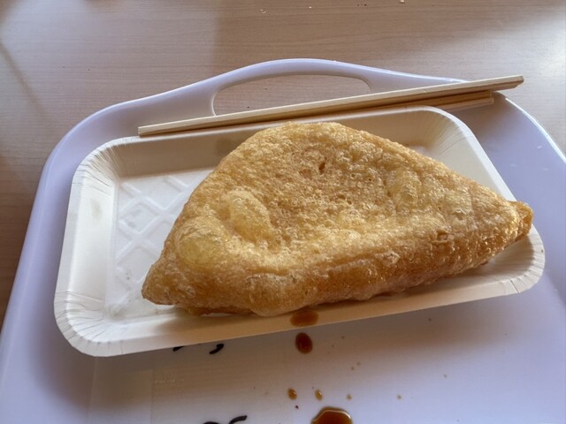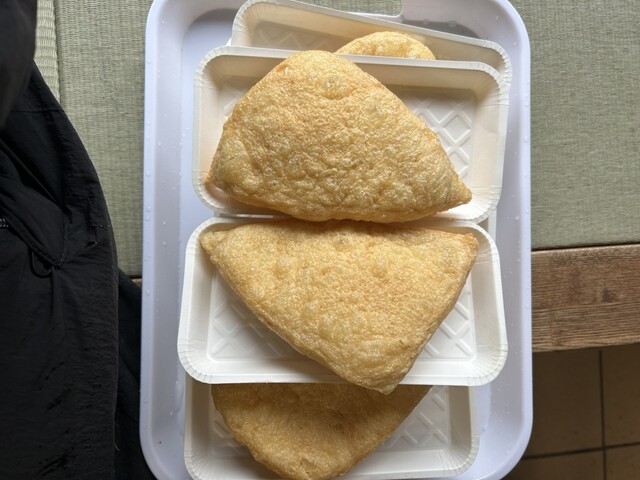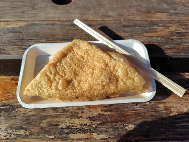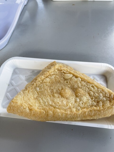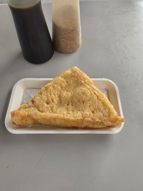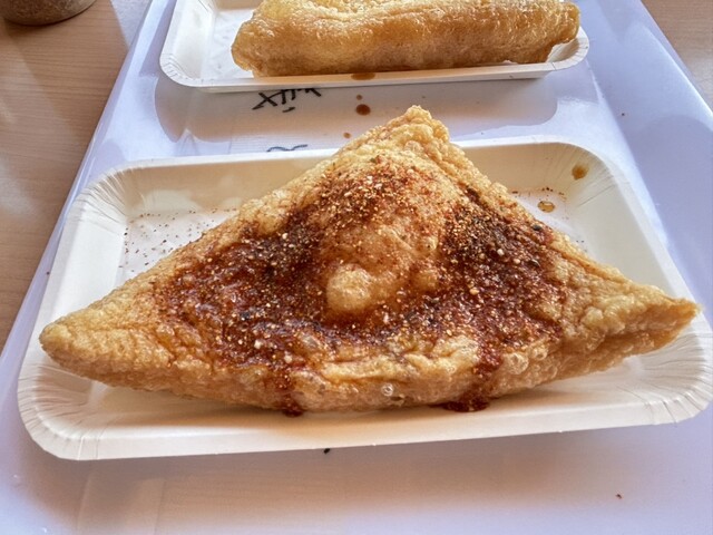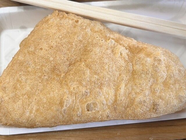 店内入り三角定義あぶらあげの「あげたて」を妻の分と合わせて2枚注文し、受け取り外の空いてい...