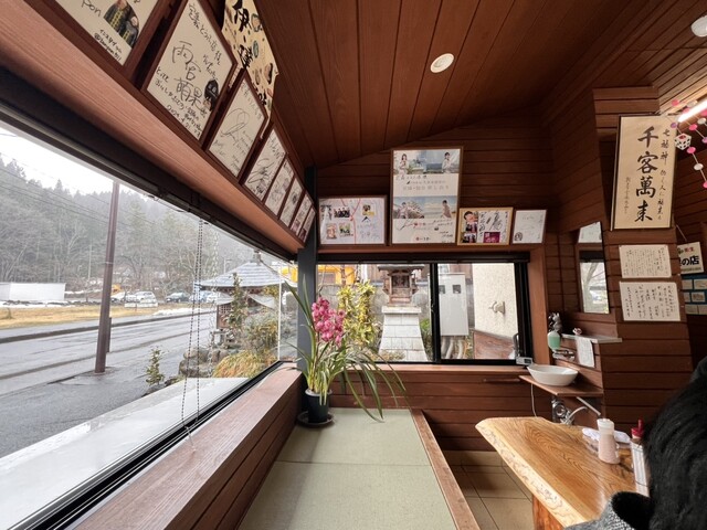 連休の最終日のお昼ころで、定義山の入口の駐車場は、満車でしたが、少し待ったら駐車できました、そこから通路を通るとお店のなかでした。