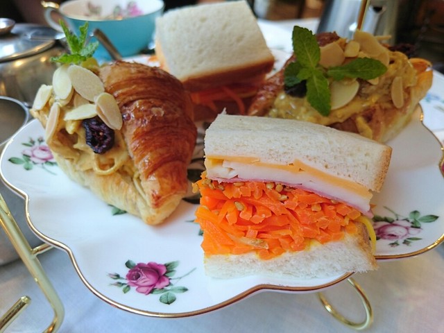下段には、ニンジンがぎっしりはさみ込まれたサンドウィッチと、カレー風味のマヨネーズで和えたチキンをはさんだクロワッサンサンド。
