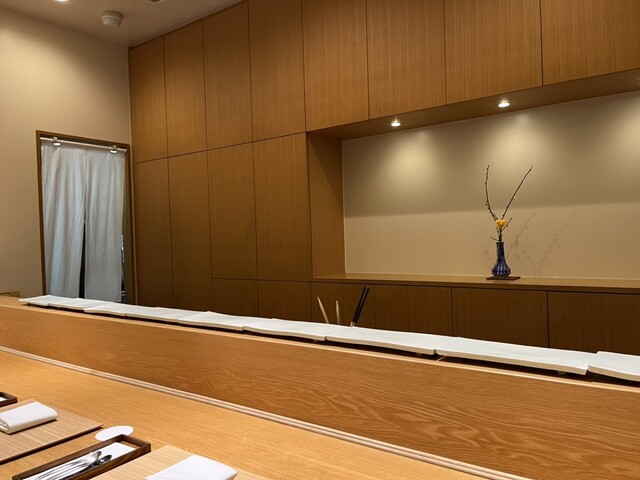 中はすっきりとした木彫のカウンター、半...