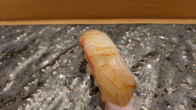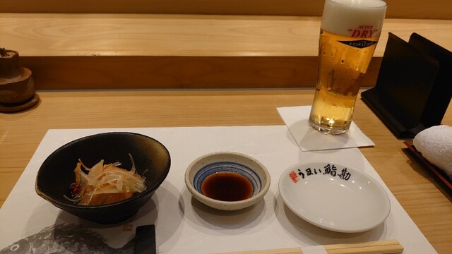 案内されたのはカウンター席で、店内は高級感があり落ち着いた雰囲気。若い板前さんが寿司を握っていました。