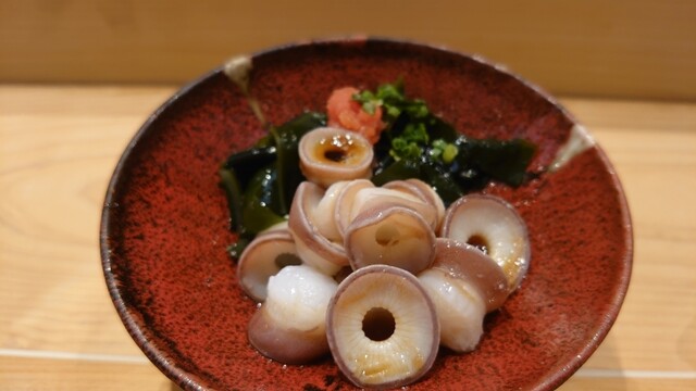 お通しはあわびつぶ貝@440円。