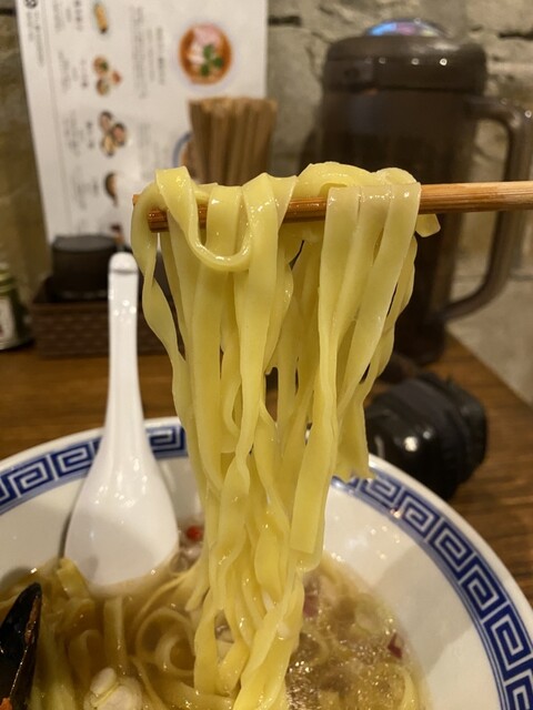 貝がしっかり効いたスープで麺が太く平たいタイプでこうい...