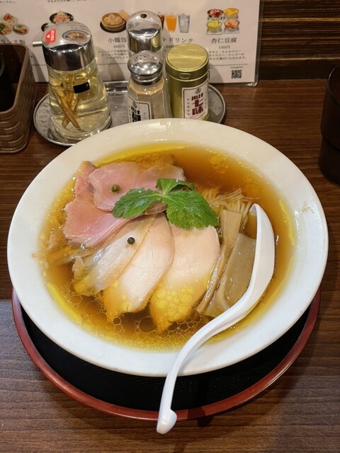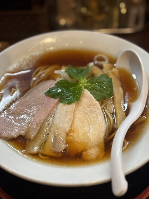 澄んだ醤油スープです。チャーシューは鶏一枚、異なる種類の豚が二枚と...