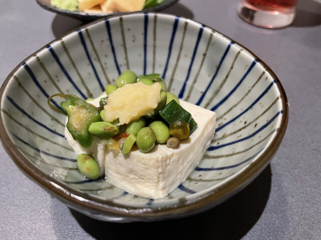 お通しは冷奴。枝豆や、山形のだしのようなものが乗っていました。