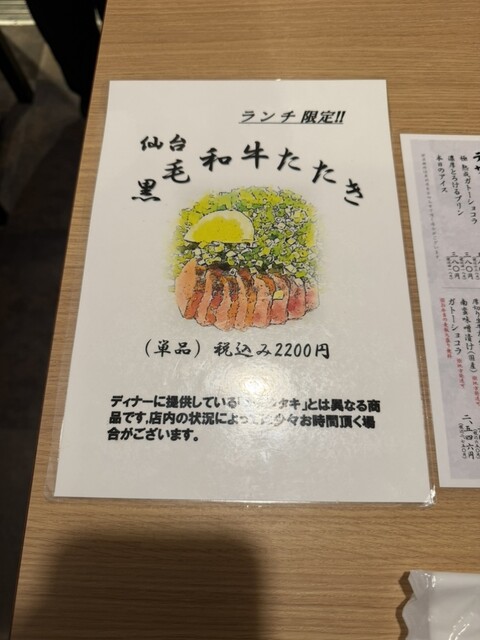 仙台旅行の最後の晩餐で伺うべく、Table checkで事前に予約しました。行きたいお店がたくさんあったため、人気店でも予約ができるこちらの店舗は大変助かりました。名物の牛たたきはとても美味しかったで...