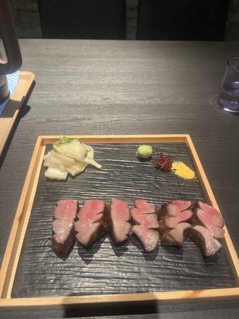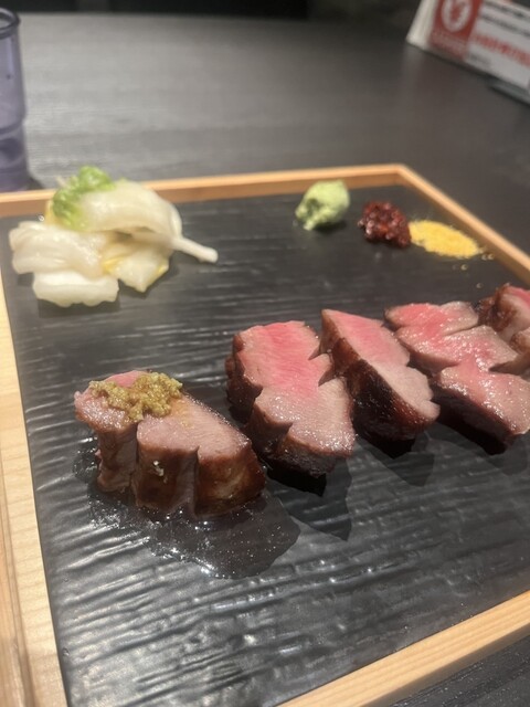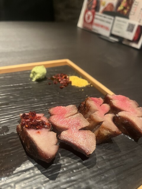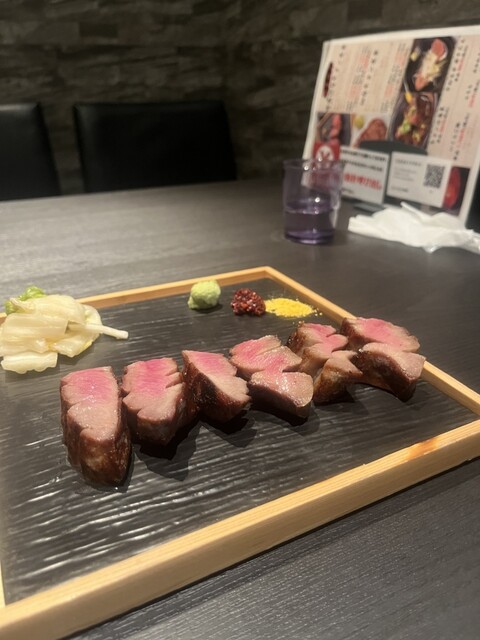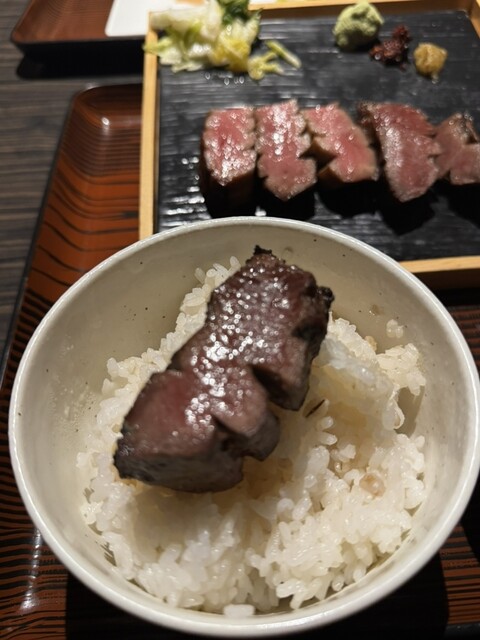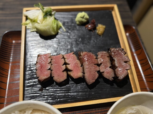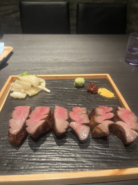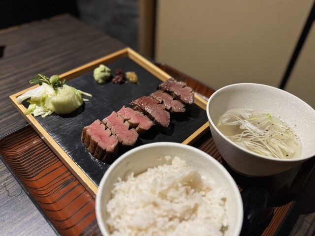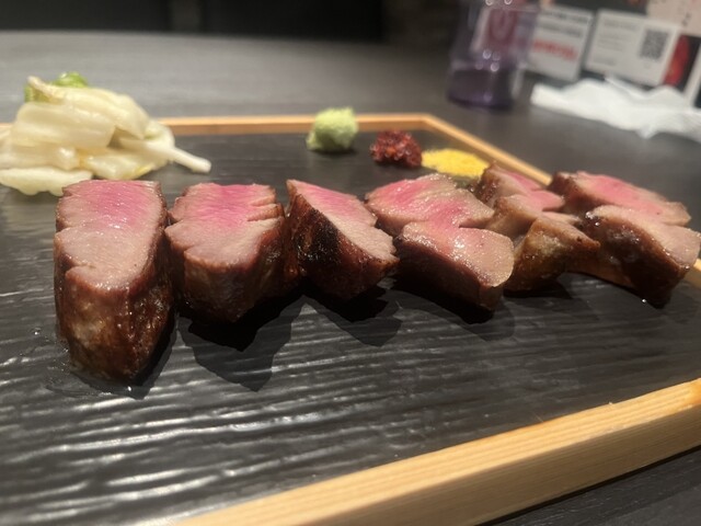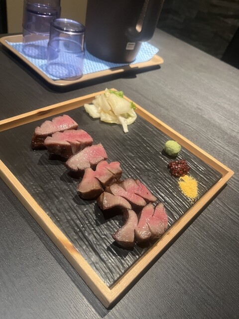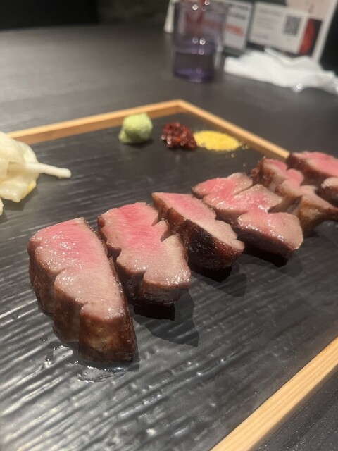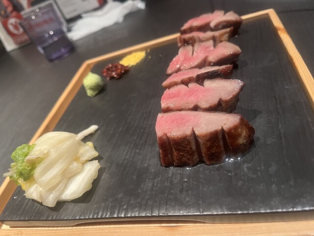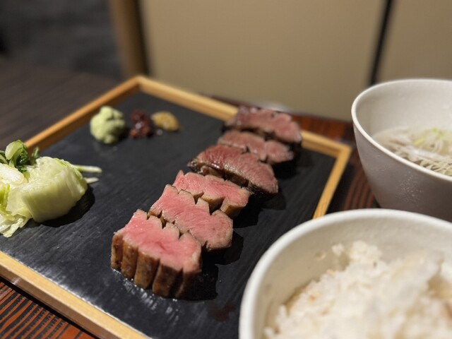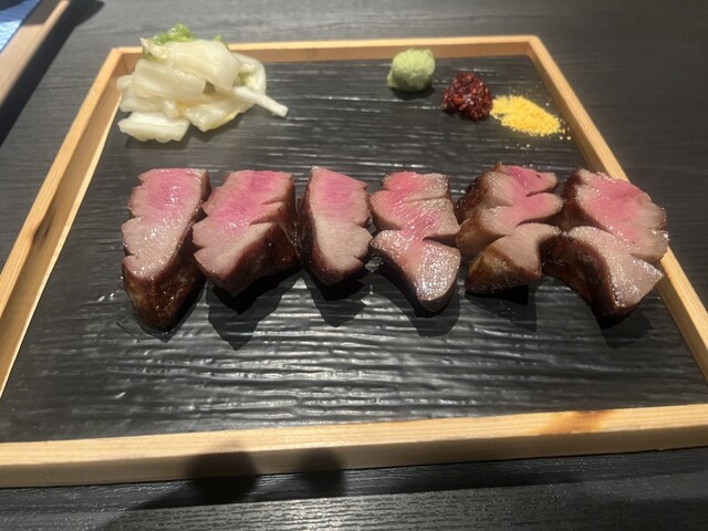 極々厚で、炭火で香ばしく焼かれた表面と、レアな中の赤身が絶妙。