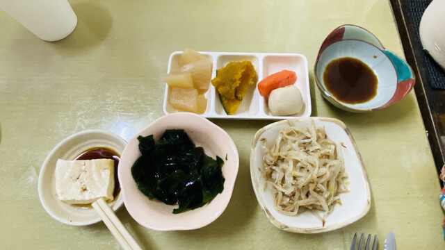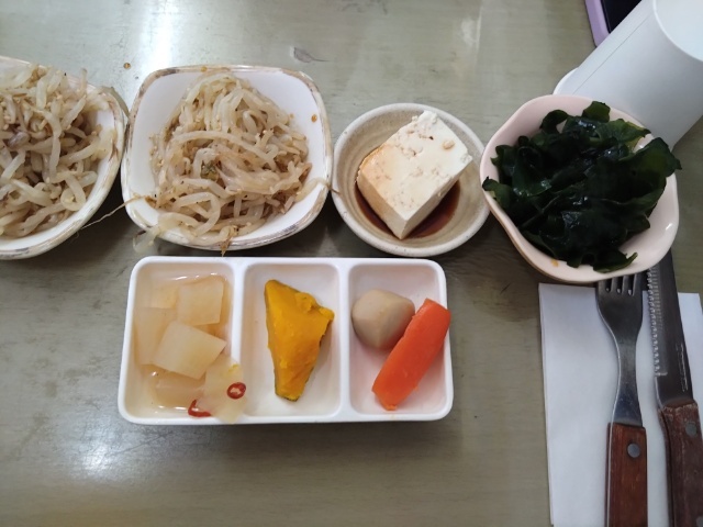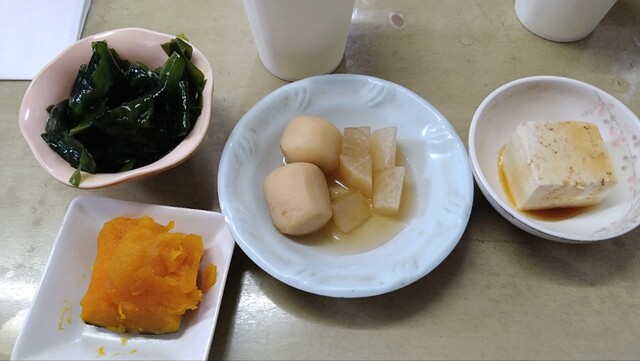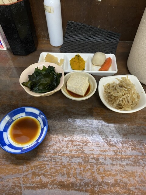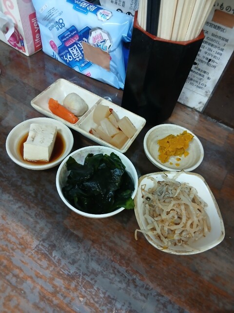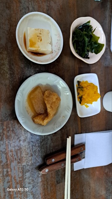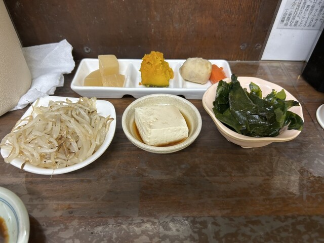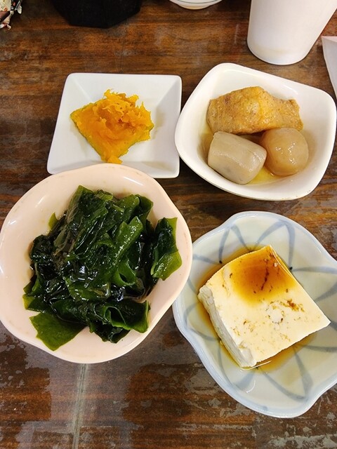 店内一番乗りで入ると既に全席に小鉢などおかずが並べられていて、本日の小鉢はワカメポン酢と冷奴。おかず皿は大根煮物、カボチャの煮付け、里芋と人参煮付けでした。