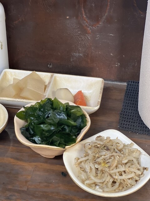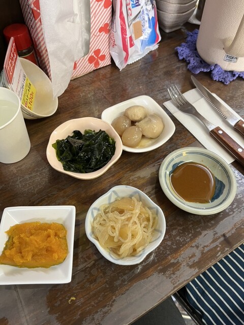 個性的な店主が1人で仕切るお店ですが、ワカメサラダ、冷奴、ナムル、カボチャ、野菜の煮物な...