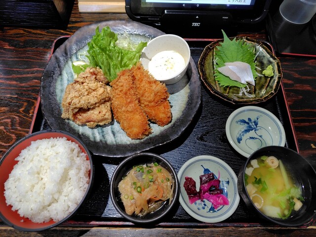 数量限定 特別ランチ1,213円。おなかが空いていなかったので、ご飯少なめでお願いしました。本日の魚料理+鶏の唐揚げ1個+ちょいとお刺身などが付いて数量限定なので、これに即決。本日の魚料理はタラフライで、この他に唐揚げもあるので、揚げ物が好きな人には...