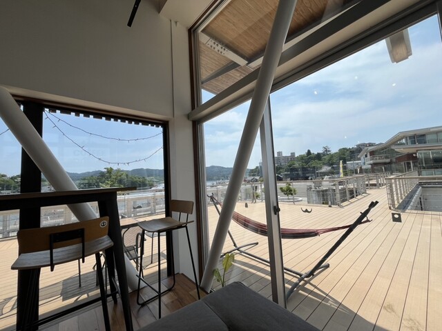 店内のソファ席から海を眺める際、デッキの...