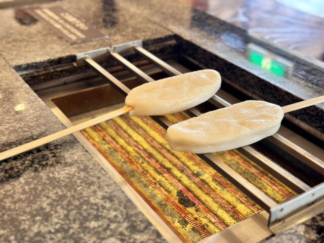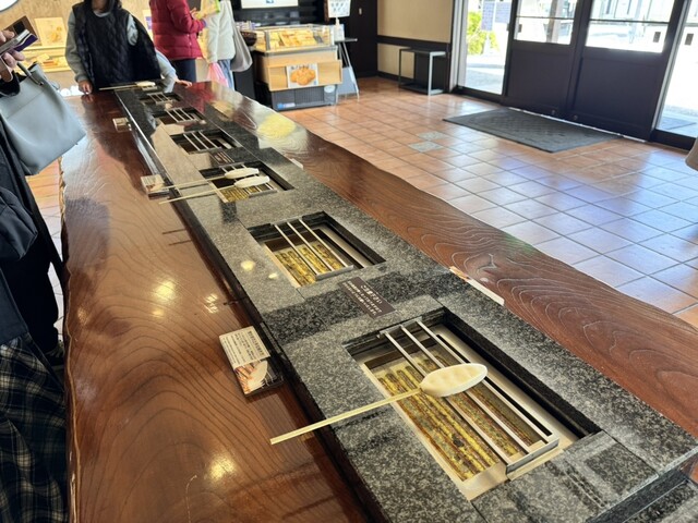 円通院からメイン通りの45号線に戻る途中、「萩の月」と「阿部ささかまぼこ」って仙台土産の両雄が並び立ったのぼり発見。見ると菓匠三全と阿部蒲鉾店が横並びでつながった造りになってる瓦屋根仕様のお土産店。如何にも観光地って感じで小洒落てる。取り合えず萩の月を確保したら、建物内を移動して右隣の阿部蒲鉾店。仙台初日にクリスロード商店街で変わりかまぼこは2つ食べたけど、普通の笹かまも食べたいって話も出てたから...