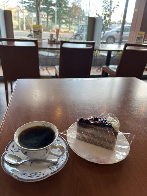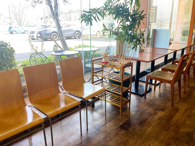 店内入ってすぐのところに注文カウンターとパン売り場、左手がカフェスペースになっています。ランチ後でおなかが空いていなかったので、ケーキセット630円を注文。選べるケーキ5種類+ドリンク5種類です。100円追加で、水出しアイスコーヒーや柚子茶なども選べます。