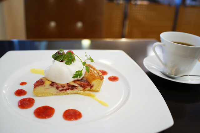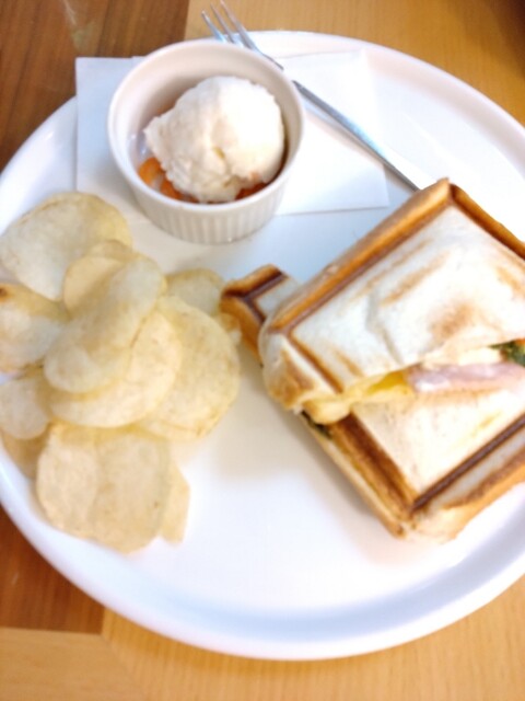 蔵王産フレッシュモッツァレラと茄子のボロネーゼホットサンドを注文。デザートにコーヒーソフトクリームまで付いて...