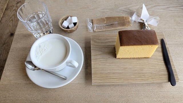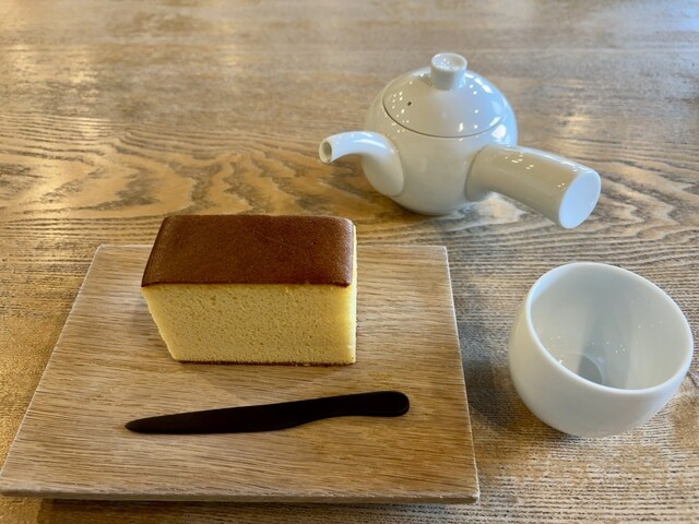 カステラセット。こちらの名物は何といっても「カステラ」!松島・蜂谷養鶏場のさくらたまごと盛岡・藤原養蜂場のアカシア蜂蜜を材料に使ったふわふわ食感のカステラはしっとりとした優しい甘味。お店の2階ではコー...