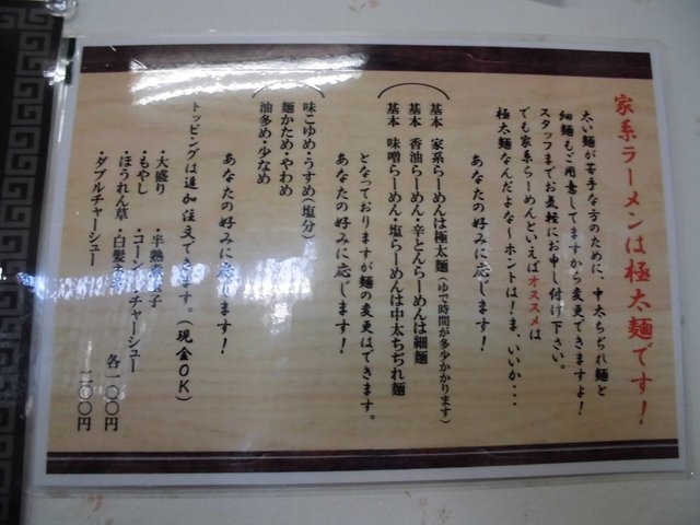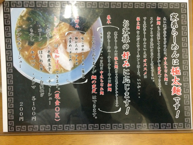 メニューにきちんと店主の主観で、家系ラーメンは太麺で食べて欲しい旨自己主張されて...