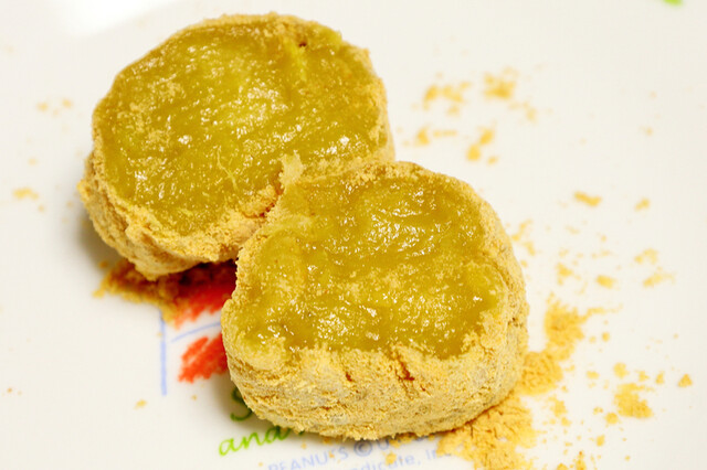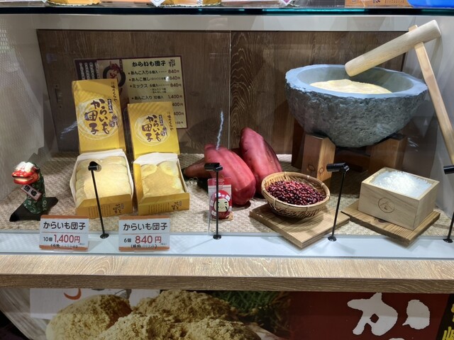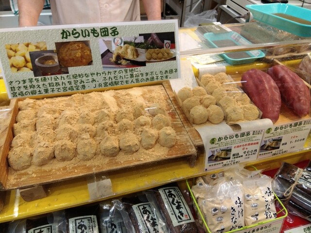 ・宮崎産さつま芋(唐芋)と餅をつき混ぜた『からいも団子』(餡入り)『ねりくり』(餡なし)を店頭実演で販売中! 小麦粉・牛乳・卵は不使用。 保存料も一切使っておりませんので、安心して召し上がっていただけます。 甘さ控えめの餡を使用しておりますので、さつま芋の優しい甘味を実感いただけます♪
