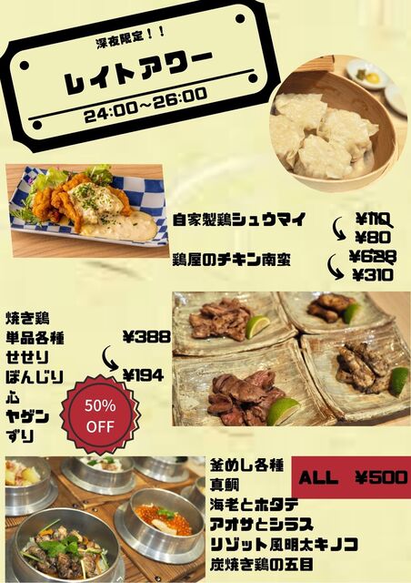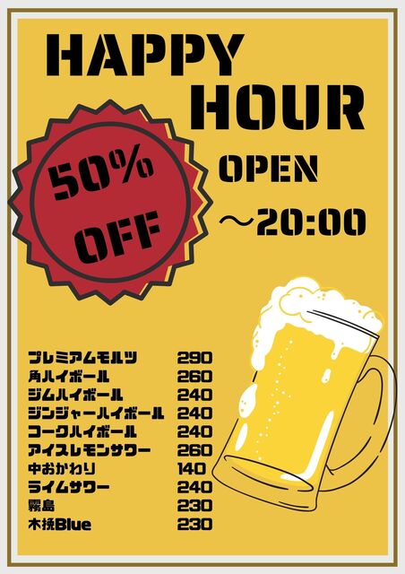 | サービス | 2時間半以上の宴会可、お祝い・サプライズ可、ドリンク持込可、テイクアウト |